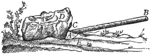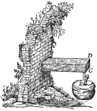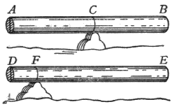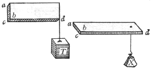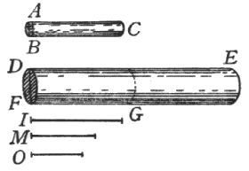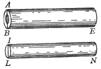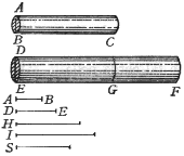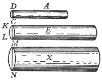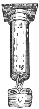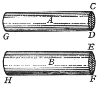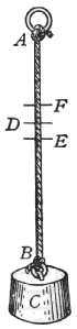 Per più chiara esplicazione di che, segniamo il cilindro o prisma AB di legno o di altra materia solida e coerente, fermato di sopra in A e pendente a piombo, al quale nell'altra estremità B sia attaccato il peso C: è manifesto che, qualunque si sia la tenacità e coerenza tra di loro delle parti di esso solido, pur che non sia infinita, potrà esser superata dalla forza del traente peso C, la cui gravità pongo che possa accrescersi quanto ne piace, e esso solido finalmente si strapperà, a guisa d'una corda. E sì come nella corda noi intendiamo, la sua resistenza derivare dalla moltitudine delle fila della canapa che la compongono, così nel legno si scorgono le sue fibre e filamenti distesi per lungo, che lo rendono grandemente più resistente allo strappamento che non sarebbe qualsivoglia canapo della medesima grossezza: ma nel cilindro di pietra o di metallo la coerenza (che ancora par maggiore) delle sue parti depende da altro glutine che da filamenti o fibre; e pure essi ancora da valido tiramento vengono spezzati.