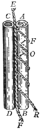 Salv. Voi benissimo dite: ma considerate appresso come una verità si tira dietro l'altra. Quel filo che stretto tra le dita non segue chi, con qualche forza tirandolo, vorrebbe di tra esse sottrarlo, resiste perché da doppia compressione vien ritenuto; avvenga che non meno il dito superiore preme contro l'inferiore, che questo si prema contro a quello. E non è dubbio che quando di queste due premure se ne potesse ritenere una sola, resterebbe la metà di quella resistenza che dalle due congiunte dependeva; ma perché non si può con l'alzar, v. g., il dito superiore levar la sua pressione senza rimuover anco l'altra parte, conviene con nuovo artifizio conservarne una di loro, e trovar modo che l'istesso filo comprima se medesimo contro al dito o altro corpo solido sopra 'l quale si posa, e far sì che l'istessa forza che lo tira per separarnelo, tanto più ve lo comprima, quanto più gagliardamente lo tira: e questo si conseguirà con l'avvolgere a guisa di spira il filo medesimo intorno al solido; il che acciò meglio s'intenda, ne segnerò un poco di figura.