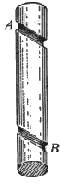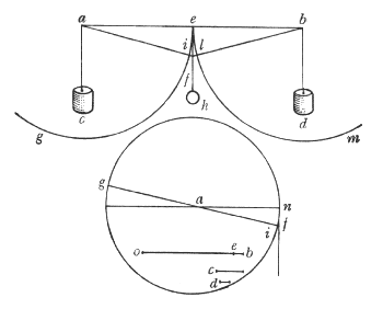Intorno a un simil cilindro di legno AB, grosso come una canna e lungo circa un palmo, incavò un canaletto in forma di spira, di una voluta e mezo e non più, e di larghezza capace della corda che voleva adoprare; e questa fece entrare per il canale dal termine A ed uscire per l'altro B, circondando poi tal cilindro e corda con un cannone pur di legno, o vero anco di latta, ma diviso per lungo ed ingangherato, sì che liberamente potesse aprirsi e chiudersi: ed abbracciando poi e strignendo con ambe le mani esso cannone, raccomandata la corda a un fermo ritegno di sopra, si sospese su le braccia; e riuscì tale la compressione della corda tra 'l cannone ambiente e 'l cilindro, che, ad arbitrio suo, strignendo fortemente le mani poteva sostenersi senza calare ed allentandole un poco si calava lentamente a suo piacimento.