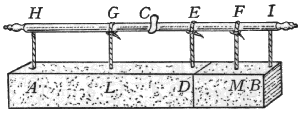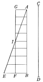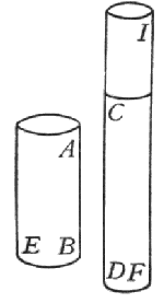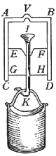 Figuro, questo CABD essere il profilo di un cilindro di metallo o di vetro, che sarebbe meglio, voto dentro, ma giustissimamente tornito, nel cui concavo entri con esquisitissimo contatto un cilindro di legno, il cui profilo noto EGHF, il qual cilindro si possa spignere in su e 'n giù; e questo voglio che sia bucato nel mezzo, sì che vi passi un filo di ferro, oncinato nell'estremità K, e l'altro capo I vadia ingrossandosi in forma di cono o turbine, facendo che il foro fatto nel legno sia nella parte di sopra esso ancora incavato in forma di conica superficie, aggiustata puntualmente per ricevere la conica estremità I del ferro IK, qualunque volta si tiri giù dalla parte K. Inserto il legno, o vogliamolo chiamar zaffo, EH nel cavo cilindro AD, non voglio ch'arrivi sino alla superior superficie di esso cilindro, ma che resti lontano due o tre dita; e tale spazio deve esser ripieno di acqua, la quale vi si metterà tenendo il vaso con la bocca CD all'in su e calcandovi sopra il zaffo EH, col tenere il turbine I remoto alquanto dal cavo del legno per lasciar l'esito all'aria, che nel calcare il zaffo se n'uscirà per il foro del legno, che perciò si fa alquanto più largo della grossezza dell'asticciuola di ferro IK. Dato l'esito all'aria e ritirato il ferro, che ben suggelli su 'legno col suo turbine I, si rivolterà il vaso tutto con la bocca all'in giù, ed attaccando all'oncino K un recipiente da mettervi dentro rena o altra materia grave, si caricherà tanto, che finalmente la superior superficie EF del zaffo si staccherà dall'inferiore dell'acqua, alla quale niente altro la teneva congiunta che la repugnanza del vacuo; pesando poi il zaffo col ferro col recipiente e con ciò che vi sarà dentro, aremo la quantità della forza del vacuo: e se, attaccato a un cilindro di marmo o di cristallo, grosso quanto il cilindro dell'acqua, peso tale che, insieme col peso proprio dell'istesso marmo o cristallo, pareggi la gravità di tutte le nominate bagaglie, ne seguirà la rottura, potremo senza verun dubbio affermare, la sola ragion del vacuo tener le parti del marmo e cristallo congiunte; ma non bastando, e che per romperlo bisogni aggiugnervi quattro volte altrettanto peso, converrà dire, la resistenza del vacuo esser delle cinque parti una, e l'altra quadrupla di quella del vacuo.