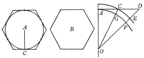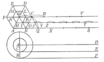 Però intendiamo un poligono equilatero ed equiangolo, di quanti lati esser si voglia, descritto intorno a questo centro G, e sia per ora un esagono ABCDEF; simile al quale, e ad esso concentrico, ne descriveremo un altro minore, quale noteremo HIKLMN: e del maggiore si prolunghi un lato AB indeterminatamente verso S, e del minore il rispondente lato HI sia verso la medesima parte similmente prodotto, segnando la linea HT parallela all'AS, e per il centro passi l'altra, alle medesime equidistante, GV. Fatto questo, intendiamo il maggior poligono rivolgersi sopra la linea AS, portando seco l'altro poligono minore. È chiaro che, stando fisso il punto B, termine del lato AB, mentre si comincia la revoluzione, l'angolo A si solleverà, e 'l punto C s'abbasserà descrivendo l'arco CQ, sì che il lato BC si adatti alla linea a se stesso eguale BQ: ma in tal conversione l'angolo I del minor poligono si eleverà sopra la linea IT, per esser la IB obliqua sopra l'AS, né prima tornerà il punto I su la parallela IT, se non quando il punto C sarà pervenuto in Q; allora l'I sarà caduto in O, dopo aver descritto l'arco IO fuori della linea HT, ed allora il lato IK sarà passato in OP: ma il centro G tra tanto sempre averà caminato fuori della linea GV, su la quale non sarà tornato se non dopo aver descritto l'arco GC. Fatto questo primo passo, il poligono maggiore sarà trasferito a posare co 'l lato BC su la linea BQ, il lato IK del minore sopra la linea OP, avendo saltato tutta la parte IO senza toccarla, e 'l centro G pervenuto in C, facendo tutto il suo corso fuori della parallela GV, e finalmente tutta la figura si sarà rimessa in un posto simile al primo: sì che continuandosi la revoluzione e venendo al secondo passo, il lato del maggior poligono CD si adatterà alla parte QX, il KL del minore (avendo prima saltato l'arco PY) caderà in YZ, ed il centro, procedendo sempre fuori della GV, in essa caderà solamente in R, dopo il gran salto CR: ed in ultimo, finita una intera conversione, il maggior poligono avrà calcate sopra la sua AS sei linee eguali al suo perimetro, senza veruna interposizione; il poligono minore arà parimente impresse sei linee eguali all'ambito suo, ma discontinuate dall'interposizione de' cinque archi, sotto i quali restano le corde, parti della parallela HT, non tocche dal poligono; e finalmente il centro G non è convenuto mai con la parallela GV, salvo che in sei punti. Di qui potete comprendere come lo spazio passato dal minor poligono è quasi eguale al passato del maggiore, cioè la linea HT alla AS, della quale è solamente minore quanto è la corda d'uno di questi archi, intendendo però la linea HT insieme con li spazii de i cinque archi. Ora questo, che vi ho esposto e dichiarato nell'esempio di questi essagoni, vorrei che intendeste accadere di tutti gli altri poligoni, di quanti lati esser si voglino, purché siano simili, concentrici e congiunti, e che alla conversion del maggiore s'intenda rigirarsi anco l'altro, quanto si voglia minore; che intendeste, dico, le linee da essi passate esser prossimamente eguali, computando nello spazio passato dal minore gl'intervalli sotto gli archetti, non tocchi da parte veruna del perimetro di esso minor poligono. Passa dunque il gran poligono di mille lati, e misura consequentemente, una linea retta eguale al suo ambito; e nell'istesso tempo il piccolo passa una prossimamente egual linea, ma interrottamente composta di mille particelle eguali a i suoi mille lati con l'interposizione di mille spazii vacui, che tali possiamo chiamargli in relazione alle mille lineette toccate da i lati del poligono: ed il detto sin qui non ha veruna difficoltà o dubitazione. Ma ditemi: se intorno a un centro, qual sia, v. g., questo punto A, noi descriveremo due cerchi concentrici ed insieme uniti, e che da i punti C, B de i lor semidiametri siano tirate le tangenti CE, BF, e ad esse per il centro A la parallela AD, intendendo girato il cerchio maggiore sopra la linea BF (posta eguale alla di lui circonferenza, come parimente le altre due CE, AD), compita che abbia una revoluzione, che averà fatto il minor cerchio, e che il centro? Questo sicuramente averà scorsa e toccata tutta la linea AD, e la circonferenza di quello averà con li suoi toccamenti misurata tutta la CE, facendo l'istesso che fecero i poligoni di sopra: in questo solamente differenti, che la linea HT non fu tocca in tutte le sue parti del perimetro del minor poligono, ma ne furon lasciate tante intatte, con l'interposizione de' vacui saltati, quante furon le parti tocche da i lati; ma qui ne i cerchi mai non si separa la circonferenza del minor cerchio della linea CE, sì che alcuna sua parte non venga tocca, né mai quello che tocca della circonferenza è manco del toccato nella retta. Or come dunque può senza salti scorrere il cerchio minore una linea tanto maggiore della sua circonferenza?