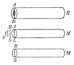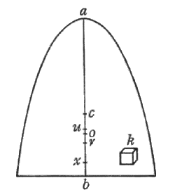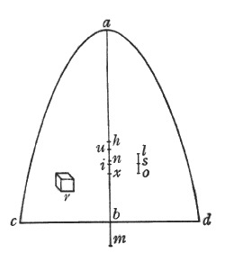 Salv. Molto destramente ci muove il Sig. Semplicio le difficoltà, ed in parte ci sumministra i rimedii, quanto alla penetrazion dell'aria per il legno, o tra 'l legno e 'l vetro. Ma io, oltre di ciò, noto che potremo nell'istesso tempo accorgerci, con acquisto di nuove cognizioni, se le promosse difficoltà aranno luogo. Imperò che, se l'acqua sarà per natura, se ben con violenza, distraibile, come accade nell'aria, si vedrà il zaffo calare; e se faremo nella parte superiore del vetro un poco di ombelico prominente, come questo V, penetrando, per la sustanza o porosità del vetro o del legno, aria o altra più tenue e spiritosa materia, si vedrà radunare (cedendogli l'acqua) nell'eminenza V: le quali cose quando non si scorgano, verremo assicurati, l'esperienza esser con le debite cautele stata tentata; e conosceremo, l'acqua non esser distraibile, né il vetro esser permeabile da veruna materia, benché sottilissima.