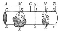 E da quanto si è detto parmi che apertamente si comprenda, come gli due gravi diseguali CS, SD non pure pesino egualmente pendendo da distanze le quali contrariamente abbino la medesima proporzione, ma di più come, in rei natura, sia il medesimo effetto, che se in distanze eguali si sospendessero pesi eguali: essendo che la gravità del peso CS in un certo modo virtualmente si diffonde oltre il sostegno G, e l'altra del peso SD dal medesimo si ritira, come, essaminando bene quanto si è detto circa la presente figura, ogni speculativo giudizio può comprendere. E, stante la medesima gravità dei pesi ed i medesimi termini delle suspensioni, quando bene si variassero le loro figure, riducendole in forme sferiche, conforme alle due X, Z, o in altre, non si dubiterà che il medesimo equilibrio sia per seguire; essendo la figura accidente di qualità ed impotente ad alterare la gravezza, che più presto dalla quantità deriva. Onde universalmente concluderemo, esser verissimo che pesi diseguali pesino egualmente, sospesi contrariamente da distanze diseguali, che abbino l'istessa proporzione dei pesi.