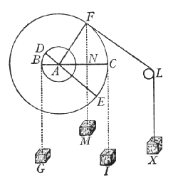 sostenuta nel punto A, ed il peso G pendente dal punto B, essendo la forza posta in C, è manifesto che, trasferendo la lieva nel sito DAE, il peso G si alzerà secondo la distanza BD, ma non molto più si potria seguitare di elevarlo: sì che volendo pure alzarlo ancora, saria necessario, fermandolo con qualch'altro sostegno in questo sito, rimettere la lieva nel pristino sito BAC, ed, apprendendo di nuovo il peso, rialzarlo un'altra volta in simile altezza BD; ed in questa guisa, reiterando l'istesso molte volte, si verria con moto interrotto a fare l'elevazione del peso; il che torneria per diversi rispetti non molto commodo. Onde si è sovvenuto a questa difficoltà col trovar modo di unir insieme quasi che infinite lieve, perpetuando l'operazione senza interrompimento veruno: e ciò si è fatto col formare una ruota intorno al centro A, secondo il semidiametro AC, ed un asse intorno al medesimo centro, del quale sia semidiametro la linea BA, e tutto questo di legno forte o di altra materia ferma e salda; sostenendo poi tutta la machina con un perno piantato nel centro A, che passi dall'una all'altra parte, dove sia da due fermi sostegni ritenuto. E circondata intorno all'asse la corda DBG, da cui penda il peso G, ed applicando un'altra corda intorno alla maggior ruota, alla quale sia appeso l'altro grave I, è manifesto che, avendo la lunghezza CA all'altra AB quella proporzione medesima che il peso G al peso I, potrà esso I sostenere il grave G, e con ogni piccolo momento di più lo moverà. E perché, volgendosi l'asse insieme con la ruota, le corde, che sostengono pesi, si troveranno sempre pendenti e contingenti l'estreme circonferenze di essa ruota ed asse, sì che sempre manterranno un simile sito e disposizione alle distanze BA, AC, si verrà a perpetuare il moto, discendendo il peso I, e costringendo a montare l'altro G. Dove si deve notare la necessità di circondare la corda intorno alla ruota, acciò che il peso I penda secondo la linea contingente la circonferenza di detta ruota: ché se si sospendesse il medesimo peso sì che dipendesse dal punto F, segando detta ruota, come si vede, per la linea FNM, non più si faria il moto, sendo diminuito il momento del peso M, il quale non graverebbe più che se pendesse dal punto N; perché la distanza della sua sospensione dal centro A viene determinata dalla linea AN, che perpendicolarmente casca sopra la corda FM, e non più dal semidiametro della ruota AF, il quale ad angoli diseguali casca sopra la detta linea FM. Facendosi dunque forza nella circonferenza della ruota da corpo grave ed inanimato, il quale non abbia altro impeto che di andare al basso, è necessario che sia sospeso da una linea, la quale sia contingente della ruota, e non che la seghi. Ma se nella medesima circonferenza fusse applicata forza animata, la quale avesse momento di far impeto per tutti i versi, potria far l'effetto constituita in qual si voglia luogo di detta circonferenza: e così, posta in F leverebbe il peso G col volgere intorno la ruota, tirando non, secondo la linea FM, al basso, ma in traverso, secondo la contingente FL, la quale farà angolo retto con quella che dal centro A si tira al punto del contatto; perché, venendo in questa forma misurata la distanza dal centro A alla forza posta in F secondo la linea AF, perpendicolare alla FL, per la quale si fa l'impeto, non si verrà ad avere alterata in parte alcuna la forma dell'uso della lieva. E notisi, che l'istesso si saria potuto fare ancora con una forza inanimata; pur che si fusse trovato modo di far sì, che il suo momento facesse impeto nel punto F, attraendo secondo la linea contingente FL: il che si faria con l'aggiungere sotto la linea FL una girella volubile, facendo passare sopra di essa la corda avvolta intorno alla ruota, come si vede per la linea FLX, sospendendogli nell'estremità il peso X, eguale all'altro I, il quale, essercitando la sua forza secondo la linea FL, verrà a conservare dal centro A distanza sempre eguale al semidiametro della ruota. E da quanto si è dichiarato, ne raccoglieremo per conclusione, in questo stromento la forza al peso aver sempre l'istessa proporzione, che il semidiametro dell'asse al semidiametro della ruota.
