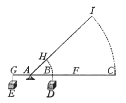 Imperò che, essendo la linea retta AB, e dalli estremi punti di essa pendendo due eguali pesi, preso il punto C nel mezzo di essa linea, si farà sopra di esso l'equilibrio; e questo, per essere la distanza AC eguale alla distanza CB. Ma se, elevando la linea CB e girandola intorno al punto C, sarà trasferita in CD, sì che la libra resti secondo le due linee AC, CD, gli due eguali pesi pendenti dai termini A, D non più peseranno egualmente sopra il punto C; perché la distanza del peso posto in D è fatta minor di quello che era mentre si ritrovava in B. Imperò che, se considereremo le linee per le quali i detti gravi fanno impeto, e discenderebbono quando liberamente si movessero, non è dubbio alcuno che sariano le linee AG, DF, BH: fa dunque momento ed impeto il peso pendente dal punto D secondo la linea DF; ma quando pendeva dal punto B, faceva impeto nella linea BH; e perché essa linea DF resta più vicina al sostegno C di quello che faccia la linea BH, perciò doviamo intendere, gli pesi pendenti dalli punti A, D non essere in distanze eguali dal punto C, ma sì bene quando saranno constituiti secondo la linea retta ACB. E finalmente si deve aver avvertenza di misurare le distanze con linee, che ad angoli retti caschino sopra quelle nelle quali i gravi stanno pendenti, e si moveriano quando liberamente scendessero.