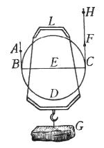 volubile intorno al centro E, collocata nella sua cassa o armatura BLC, dalla quale sia sospeso il grave G; e passi intorno alla girella la corda ABDCF, della quale il capo A sia fermato a qualche ritegno stabile, e nell'altro F sia posta la forza, la quale, movendosi verso H, alzerà la machina BLC, e, consequentemente, il peso G; ed in questa operazione, dico la forza in F esser la metà del peso da lei sostenuto. Imperò che, venendo detto peso retto dalle due corde AB, FC, è manifesta cosa, la fatica essere egualmente compartita tra la forza F ed il sostegno A. Ed essaminando più sottilmente la natura di questo stromento, producendo il diametro della girella BEC, vedremo farsi una lieva, dal cui mezzo, ciò è sotto il punto E, pende il grave, ed il sostegno viene ad essere nell'estremità B, e la forza nell'altra estremità C: onde, per quello che di sopra si è dimostrato, la forza al peso averà la proporzione medesima, che ha la distanza EB alla distanza BC; però sarà la metà di esso peso. E benché, nell'alzarsi la forza verso H, la girella vada intorno, non però si muta mai quel rispetto e constituzione, che hanno tra di loro il sostegno B ed il centro E, da cui dipende il peso, ed il termine C, nel quale opera la forza: ma nella circunduzione si vengono bene a variare di numero li termini B, C, ma non di virtù, succedendo continuamente altri ed altri in loro luogo; onde la lieva BC viene a perpetuarsi. E qui, come negli altri strumenti si è fatto, e nei seguenti si farà sempre, non passeremo senza considerazione, come il viaggio che fa la forza venga ad essere doppio del movimento del peso. Imperò che, quando il peso sarà mosso sin che la linea BC sia pervenuta con li suoi punti B, C alli punti A, F, è necessario che le due corde eguali AB, FC si siano distese in una sola linea FH; e che, per consequenza, quando il peso sia salito per l'intervallo BA, la forza si sia mossa il doppio, ciò è da F in H.