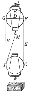 si vede, dove la corda CEFG si è fatta passare intorno alla girella superiore FG sostenuta dall'appiccagnolo L, sì che, passando la corda in H, e quivi trasferendo la forza E, sarà potente a muovere il peso X col tirare a basso. Ma non però che essa deva essere minore di quello che era in E; imperò che i momenti delle forze E, H, pendenti dalle eguali distanze FD, DG della girella superiore, restano sempre eguali; né essa superiore girella, come già si è dimostrato, arreca diminuzione alcuna nella fatica. Inoltre, essendo di già stato necessario, per l'aggiunta della girella superiore, introdurre l'appendicolo L, da chi venga sostenuta, ci tornerà di qualche commodità il levare l'altro A, a chi era raccommandato l'un capo della corda, trasferendolo ad un oncino, o anello, annesso alla parte inferiore della cassa o armatura della superiore girella, come si vede fatto in M. Ora finalmente tutta questa machina, composta di superiori ed inferiori girelle, è quella che i Greci chiamano trochlea, e noi toscanamente adimandiamo taglia.