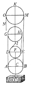 Venghiamo adesso ad applicar questa considerazione alle taglie: ed intendasi il peso X pendente dalle due girelle inferiori AB, DE, circonducendo intorno ad esse ed alla superiore girella GH la corda, come si vede per la linea IDEHGAB, sostenendo tutta la machina nel punto K. Dico adesso, che, posta la forza in M, potrà sostenere il peso X, quando sia eguale alla quarta parte di esso. Imperò che, se ci imagineremo li due diametri DE, AB, ed il peso pendente dalli punti di mezzo F, C, averemo due vetti simili alli già dichiarati, i sostegni dei quali rispondono alli punti D, A; onde la forza posta in B, o vogliamo dire in M, potrà sostenere il peso X, essendo la quarta parte di esso. E se di nuovo aggiungeremo un'altra superiore girella, facendo passare la corda in MON, trasferendo la forza M in N, potrà sostenere il medesimo peso gravando al basso, non augumentando o diminuendo forza la girella superiore, come di già si è dichiarato. E noteremo parimente, come, per fare ascendere il peso, devono passare le quattro corde BM, EH, DI, AG; onde il movente avrà a caminare quanto esse quattro corde sono lunghe, e, con tutto ciò, il peso non si moverà se non quanto è la lunghezza di una sola di esse: il che sia detto per avvertimento e confermazione di quello che più volte si è di già detto, ciò è che con qual proporzione si diminuisce la fatica nel movente, se gli accresce all'incontro lunghezza nel viaggio.