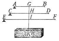 Ma se vorremo crescere la forza in proporzione sescupla, bisognerà che aggiungiamo un'altra girella alla taglia inferiore: il che acciò meglio s'intenda, metteremo avanti la presente speculazione. Intendasi dunque le tre lieve AB, CD, EF, e dai mezzi di esse G, H, I pendente comunemente il peso K, e nell'estremità B, D, F tre potenze eguali che sostenghino il peso K; sì che ciascheduna di esse ne verrà a sostenere la terza parte. E perché la potenza in B, sostenendo col vette BA il peso pendente in G, viene ad essere la metà di esso peso, e già si è detto quella sostenere il terzo del peso K: adunque il momento della forza B è eguale alla metà della terza parte del peso K, ciò è alla sesta parte di esso. Ed il medesimo si dimostrerà dell'altre forze D, F: dal che possiamo facilmente comprendere, come, ponendo nella taglia inferiore tre girelle, e nella superiore due o tre altre, possiamo multiplicare la forza secondo il numero senario. E volendo crescerla secondo qual si voglia altro numero pari, si multiplicheranno le girelle della taglia di sotto secondo la metà di quel numero, conforme al qual si ha da multiplicare la forza, circomponendo alle taglie la corda, sì che l'uno de' capi si fermi alla taglia superiore, e nell'altro sia la forza; come in questa figura