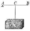 Passando ora alla dichiarazione del modo di multiplicare la forza secondo i numeri dispari, e facendo principio dalla proporzione tripla, prima metteremo avanti la presente speculazione; come che dalla sua intelligenza dependa la cognizione di tutto il presente negozio. Sia per ciò la lieva AB , il cui sostegno A; e dal mezzo di essa, ciò è dal punto C, penda il grave D, il quale sia sostenuto da due forze eguali, l'una delle quali sia applicata al punto C, e l'altra all'estremità B: dico, ciascuna di esse potenze aver momento eguale alla terza parte del peso D. Imperò che la forza in C sostiene peso eguale a sé stessa, essendo collocata nella medesima linea nella quale pende e grava il peso D: ma la forza in B sostiene del peso D parte doppia di sé stessa, essendo la sua distanza dal sostegno A, ciò è la linea BA, doppia della distanza AC, dalla quale è sospeso il grave: ma perché si suppone, le due forze in C, B essere tra di loro eguali, adunque la parte del peso D, che è sostenuta dalla forza B, è doppia della parte sostenuta dalla forza C. Se dunque del grave D siano fatte due parti, l'una doppia della rimanente, la maggiore è sostenuta dalla forza B, e la minore dalla forza C: ma questa minore è la terza parte del peso D: adunque il momento della forza C è eguale al momento della terza parte del peso D; al quale verrà, per conseguenza, ad essere eguale la forza B, avendola noi supposta eguale all'altra forza C. Onde è manifesto il nostro intento, che era di dimostrare, come ciascuna delle due potenze C, B si agguagliava alla terza parte del peso D.