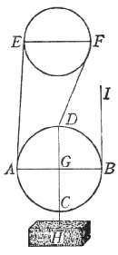 Il che avendo dimostrato, faremo passaggio alle taglie, e descrivendo la girella inferiore ACB volubile intorno al centro G, e da essa pendente il peso H, segneremo l'altra superiore EF; avvolgendo intorno ad ambedue la corda DFEACBI, di cui il capo D sia fermato alla taglia inferiore, ed all'altro I sia applicata la forza; la quale dico che, sostenendo o movendo il peso H, non sentirà altro che la terza parte della gravità di quello. Imperò che, considerando la struttura di tal machina, vederemo il diametro AB tener il luogo di una lieva, nel cui termine B viene applicata la forza I, nell'altro A è posto il sostegno, dal mezzo G è posto il grave H, e nell'istesso luogo applicata un'altra forza D; sì che il peso vien fermato dalle tre corde IB, FD, EA, le quali con eguale fatica sostengono il peso. Or, per quello che di già si è speculato, sendo le due forze eguali D, B applicate l'una al mezzo del vette AB, e l'altra al termine estremo B, è manifesto ciascheduna di esse non sentire altro che la terza parte del peso H: adunque la potenza I, avendo momento eguale al terzo del peso H, potrà sostenerlo e muoverlo. Ma però il viaggio della forza I sarà triplo al camino che farà il peso, dovendo la detta forza distendersi secondo la lunghezza delle tre corde IB, FD, EA, delle quali una sola misurerà il viaggio del peso.