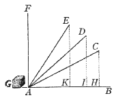 Fatte dunque cascare le perpendicolari dalli punti C, D, E sopra la linea orizontale AB, che siano CH, DI, EK, si dimostrerà, il medesimo peso esser sopra il piano elevato AC mosso da minor forza che nella perpendicolare AF (dove viene alzato da forza a sé stesso eguale), secondo la proporzione che la perpendicolare CH è minore della AC; e sopra il piano AD avere la forza al peso l'istessa proporzione, che la linea perpendicolare ID alla DA; e finalmente nel piano AE osservare la forza al peso la proporzione della KE alla EA.
