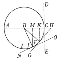 Intendasi dunque il cerchio AIC ,ed in esso il diametro ABC, ed il centro B, e due pesi di eguali momenti nelle estremità A, C; sì che, essendo la linea AC un vette o libra mobile intorno al centro B, il peso C verrà sostenuto dal peso A. Ma se c'immagineremo il braccio della libra BC essere inchinato a basso secondo la linea BF, in guisa tale però che le due linee AB, BF restino salde insieme nel punto B, allora il momento del peso C non sarà più eguale al momento del peso A, per esser diminuita la distanza del punto F dalla linea della direzione che dal sostegno B, secondo la BI, va al centro della terra. Ma se tireremo dal punto F una perpendicolare alla BC, quale è la FK, il momento del peso in F sarà come se pendesse dalla linea KB; e quanto la distanza KB è diminuita dalla distanza BA, tanto il momento del peso F è scemato dal momento del peso A. E così parimente, inchinando più il peso, come saria secondo la linea BL, il suo momento verrà scemando, e sarà come se pendesse dalla distanza BM, secondo la linea ML; nel qual punto L potrà esser sostenuto da un peso posto in A, tanto minore di sé quanto la distanza BA è maggiore della distanza BM. Vedesi dunque come, nell'inclinare a basso per la circonferenza CFLI il peso posto nell'estremità della linea BC, viene a scemarsi il suo momento ed impeto d'andare a basso di mano in mano più, per esser sostenuto più e più dalle linee BF, BL. Ma il considerare questo grave discendente, e sostenuto dalli semidiametri BF, BL ora meno e ora più, e constretto a caminare per la circonferenza CFL, non è diverso da quello che saria imaginarsi la medesima circonferenza CFLI esser una superficie così piegata, e sottoposta al medesimo mobile, sì che, appoggiandovisi egli sopra, fosse constretto a descendere in essa; perché se nell'uno e nell'altro modo disegna il mobile il medesimo viaggio, niente importerà s'egli sia sospeso dal centro B e sostenuto dal semidiametro del cerchio, o pure se, levato tale sostegno, s'appoggi e camini su la circonferenza CFLI. Onde indubitatamente potremo affermare, che, venendo al basso il grave dal punto C per la circonferenza CFLI, nel primo punto C il suo momento di discendere sia totale ed integro; perché non viene in parte alcuna sostenuto dalla circonferenza, e non è, in esso primo punto C, in disposizione a moto diverso di quello, che libero farebbe nella perpendicolare e contingente DCE. Ma se il mobile sarà constituito nel punto F, allora dalla circolare via, che gli è sottoposta, viene in parte la gravità sua sostenuta, ed il suo momento d'andare al basso diminuito con quella proporzione, con la quale la linea BK è superata dalla BC: ma quando il mobile è in F, nel primo punto di tale suo moto è come se fosse nel piano elevato secondo la contingente linea GFH, perciò che l'inclinazione della circonferenza nel punto F non differisce dall'inclinazione della contingente FG, altro che l'angolo insensibile del contatto. E nel medesimo modo troveremo, nel punto L diminuirsi il momento dell'istesso mobile, come la linea BM si diminuisce dalla BC; sì che nel piano contingente il cerchio nel punto L, qual saria secondo la linea NLO, il momento di calare al basso scema nel mobile con la medesima proporzione. Se dunque sopra il piano HG il momento del mobile si diminuisce dal suo totale impeto, quale ha nella perpendicolare DCE, secondo la proporzione della linea KB alla linea BC o BF; essendo, per la similitudine de i triangoli KBF, KFH, la proporzione medesima tra le linee KF, FH che tra le dette KB, BF, concluderemo, il momento integro ed assoluto che ha il mobile nella perpendicolare all'orizonte, a quello che ha sopra il piano inclinato HF, avere la medesima proporzione che la linea HF alla linea FK, cioè che la lunghezza del piano inclinato alla perpendicolare che da esso cascherà sopra l'orizonte. Sì che, passando a più distinta figura, quale è la presente, il momento di venire al basso che ha il mobile sopra il piano inclinato FH, al suo totale momento, con lo qual gravita nella perpendicolare all'orizonte FK, ha la medesima proporzione che essa linea KF alla FH. E se così è, resta manifesto che, sì come la forza che sostiene il peso nella perpendicolare FK deve essere ad esso eguale, così per sostenerlo nel piano inclinato FH basterà che sia tanto minore, quanto essa perpendicolare FK manca dalla linea FH. E perché, come altre volte s'è avvertito, la forza per muover il peso basta che insensibilmente superi quella che lo sostiene, però concluderemo questa universale proposizione: sopra il piano elevato la forza al peso avere la medesima proporzione, che la perpendicolare dal termine del piano tirata all'orizonte, alla lunghezza d'esso piano.