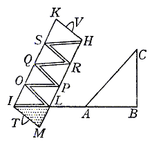 intorno alla colonna MIKH esser avvolta la linea ILOPQRSH, la quale sia un canale, per lo quale possa scorrer l'acqua: se metteremo l'estremità I nell'acqua, facendo stare la vite pendente, come dimostra il disegno, e la volgeremo in giro intorno alli due perni T, V, l'acqua per lo canale anderà scorrendo, fin che finalmente verserà fuori della bocca H. Ora dico che l'acqua, nel condursi dal punto I al punto H, è venuta sempre discendendo, ancorché il punto H sia più alto del punto I. Il che esser così, dichiareremo in tal modo. Descriveremo il triangolo ACB, il quale sia quello onde si generi la vite IH, di maniera che il canale della vite venga figurato dalla linea AC, la cui salita ed elevazione viene determinata per l'angolo CAB; cioè, che se il detto angolo sarà la terza parte o la quarta di un angolo retto, la elevazione del canale AC sarà secondo la terza o quarta parte d'un angolo retto. Ed è manifesto, che la salita d'esso canale AC verrà tolta via abbassando il punto C insino al B, perché allora il canale AC non averà elevazione alcuna; ed abbassando il punto C un poco sotto il B, l'acqua naturalmente scorrerà per lo canale AC al basso, dal punto A verso il C. Concludiamo dunque, che, essendo l'angolo A un terzo di un retto, la salita del canale AC verrà tolta via abbassandolo dalla parte C per la terza parte di un angolo retto.